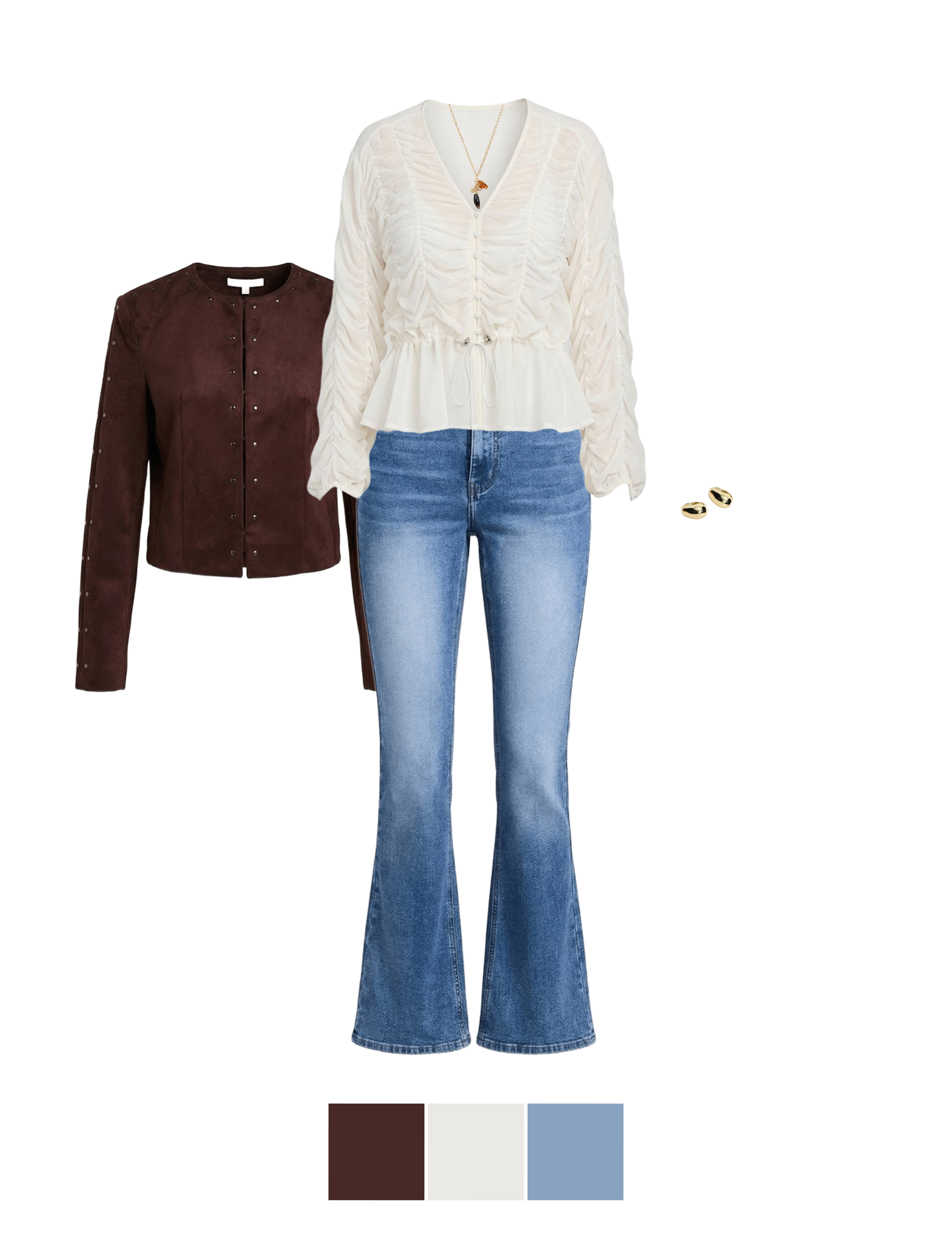 Блуза в романтичном стиле, силуэтные джинсы и приталенный жакет — расслабленный образ для театра, когда хочется сместить акцент с классики на тренды