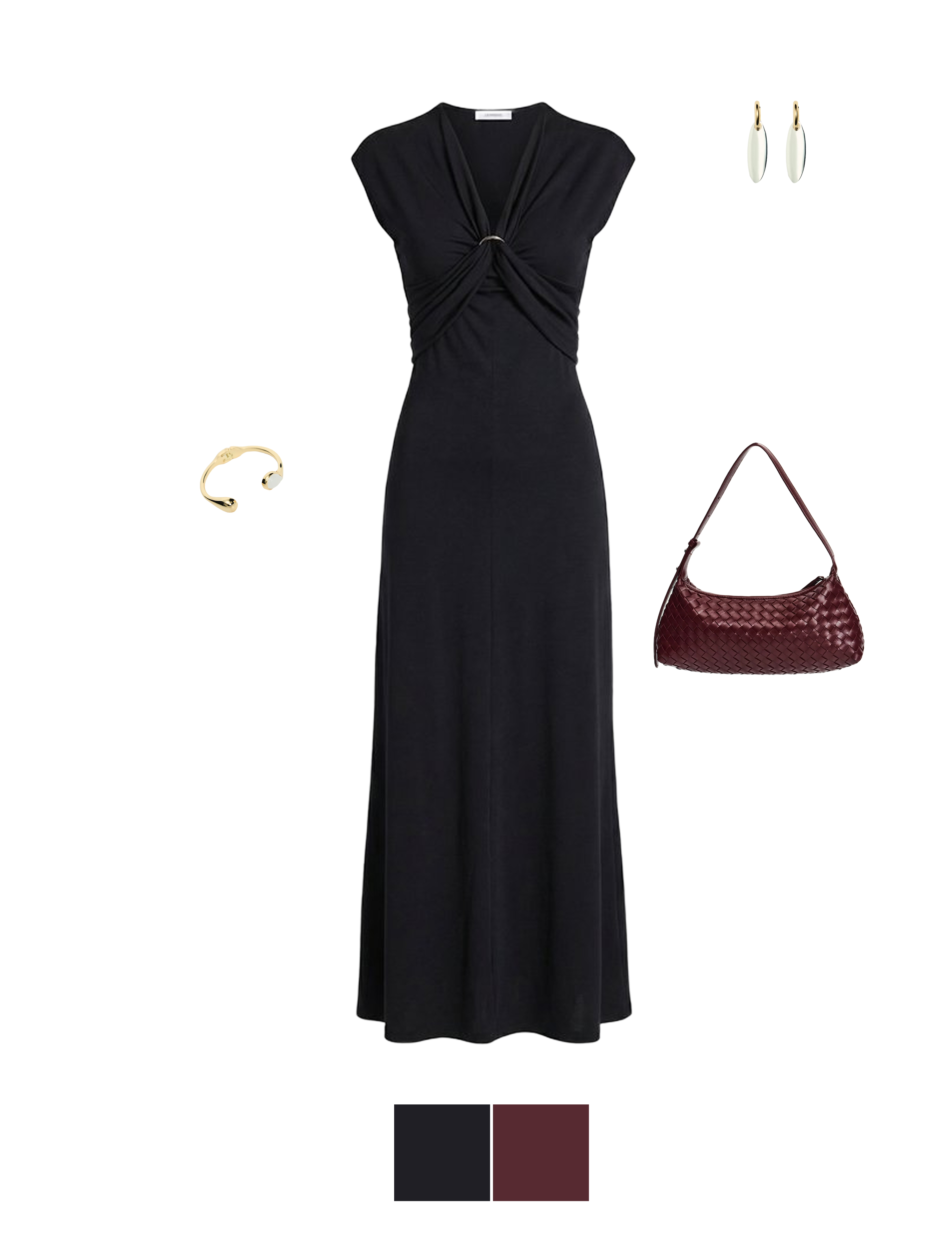 Черное платье длины миди, акцентная сумка с плетеной фактурой и украшения в цвете золота — театральная классика, которая работает всегда