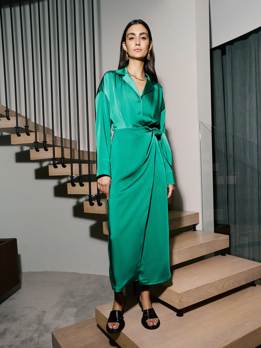 Параметры: Вырез горловины: V-образный; Застежка: пуговицы; пояс; Тип карманов: без карманов; Стиль: Деловой