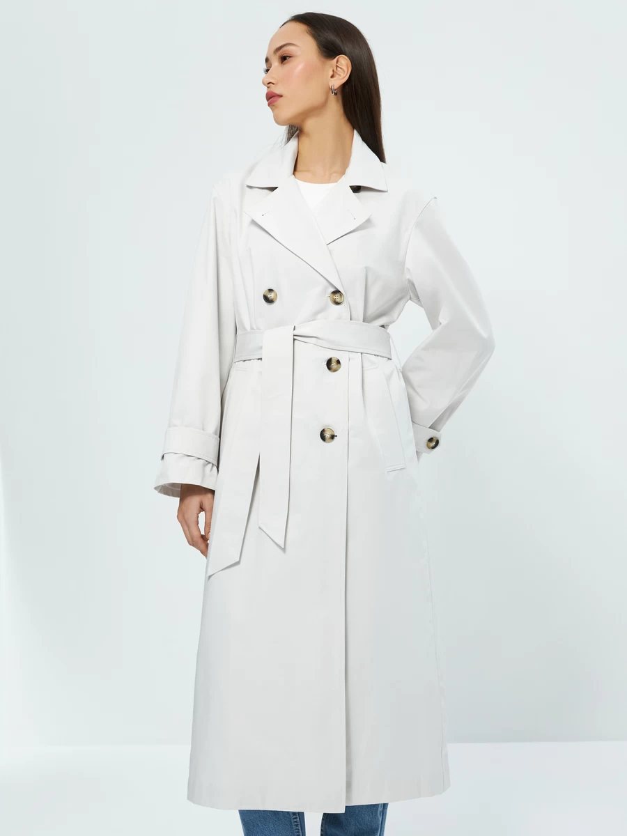 Параметры: Борты: двубортное; Застежка: пуговицы; пояс; Опции капюшона: без капюшона; Температурный режим: от +10; Тип карманов: накладные; прорезные