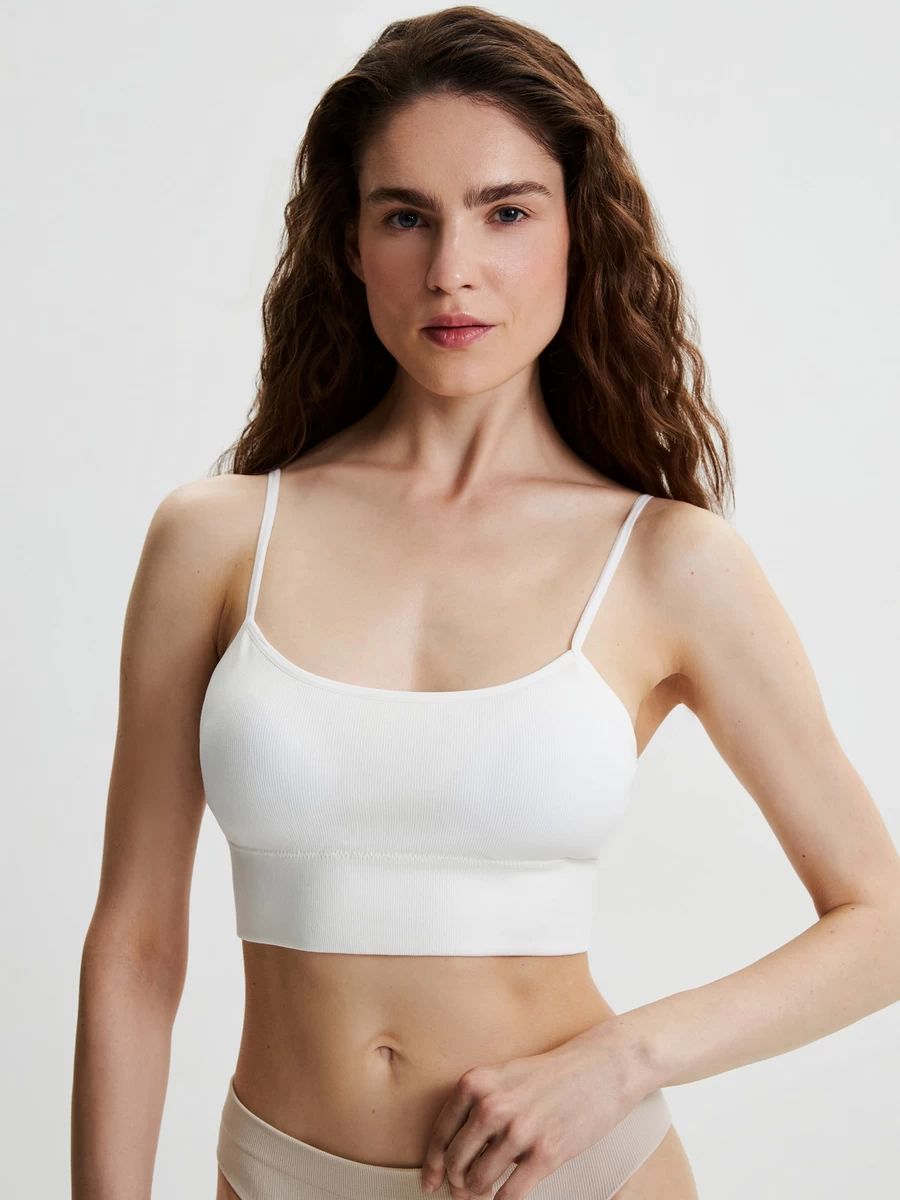 Параметры: Вид бретелей: регулируемые бретели; Вид ткани бельё: риб; Чашка: без косточек; с чашкой; Вид застежки, бельё: без застежки