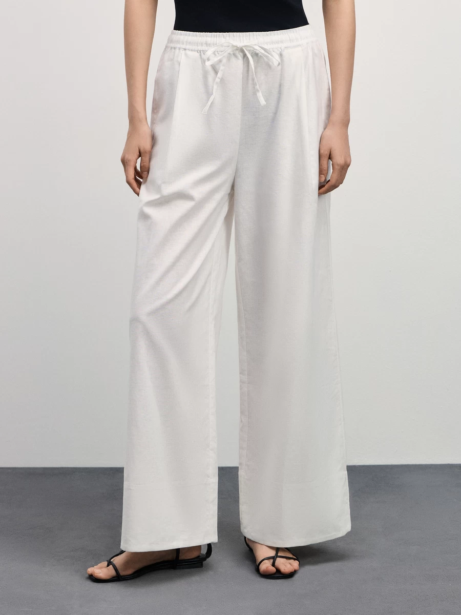 Параметры: Дата создания элемента справочника: 27.09.2023 14:39:04; Вид продукции: Поясные изделия; Классификация GPC: Брюки/Шорты; Вид застежки: завязки; Декоративные элементы: нет; Модель брюк: широкие; Тип карманов: в шве; Рисунок: нет; Комплект: Casual_лето24_июнь_костюм 1; Ручное изменение ставки НДС: Нет; Тип ростовки: для высоких; Маркетинговое наименование ZR: Брюки на завязках из хлопка и льна; Фактура материала: текстильный; Тип посадки: средняя